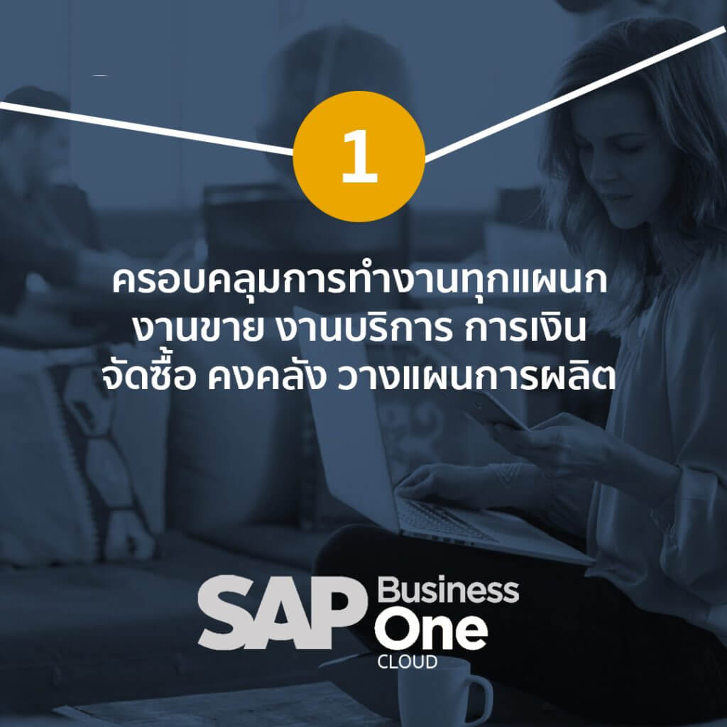SAP Business One เป็นโซลูชันครบวงจรที่ช่วยให้คุณสามารถมองเห็น ภาพรวมธุรกิจได้อย่างชัดเจนและสามารถควบคุมทุกกระบวนการทำงาน ที่เกิดขึ้นสามารถให้ข้อมูลทางธุรกิจที่สำคัญที่สามารถเข้าถึงได้ทันทีและ ง่ายดายจากทุกแผนกทั่วทั้งบริษัท ไม่เหมือนกับการใช้งานโปรแกรมทาง บัญชีและ spreadsheets ที่มีข้อจำกัดในการใช้งาน