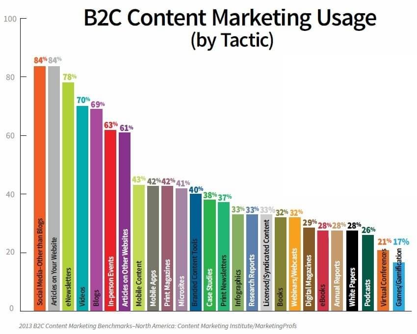เริ่มต้นจากอันดับที่ 1 Social Mediaสื่อสังคมออนไลน์ถูกนำมาใช้มากที่สุดสูงถึงร้อยละ 87 ด้วยการสร้างเนื้อหาสาระทั้งรูปภาพ วิดีโอ และข้อความ ผ่านการสนทนาในสื่อสังคมออนไลน์ อาทิ LinkedIn, Twitter, Facebook, Google+, Slideshare เป็นต้น