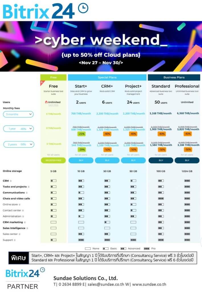ตั้งแต่วันศุกร์ที่ 27 พฤศจิกายนถึงวันจันทร์ที่ 30 พฤศจิกายน นี้ เราขอนำเสนอส่วนลดสำหรับแผนการสมัครใช้งาน Bitrix24 Cloud (CRM +, Project +, Standard, Professional)