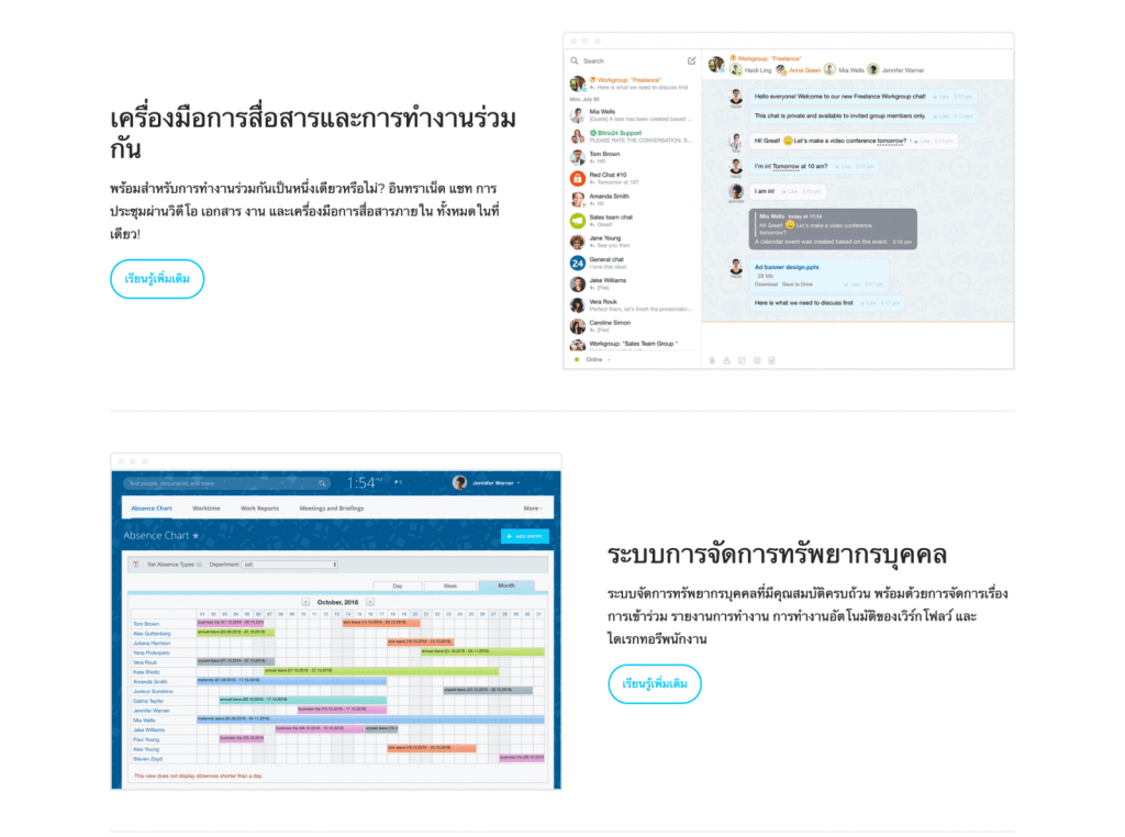 • แชท : พนักงานสามารถแชทกันแบบสดๆ ผ่าน Bitrix24 Chat แชทสามารถจัดกลุ่มตามทีม แผนก หรือโครงการ พนักงานยังสามารถแชร์ไฟล์และลิงก์ได้อีกด้วย