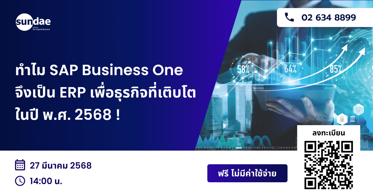 ในยุคที่ธุรกิจต้องเผชิญกับการแข่งขันที่ดุเดือด การมีระบบ ERP ที่สามารถรองรับการเติบโตได้เป็นสิ่งสำคัญ SAP Business One ได้รับการยอมรับในฐานะ ERP ชั้นนำที่ตอบโจทย์ความต้องการของธุรกิจขนาดกลางและขนาดเล็กทั่วโลก มาร่วมค้นพบว่า SAP Business One จะช่วยขับเคลื่อนธุรกิจของคุณในปี 2568 ได้อย่างไร?ผฟ