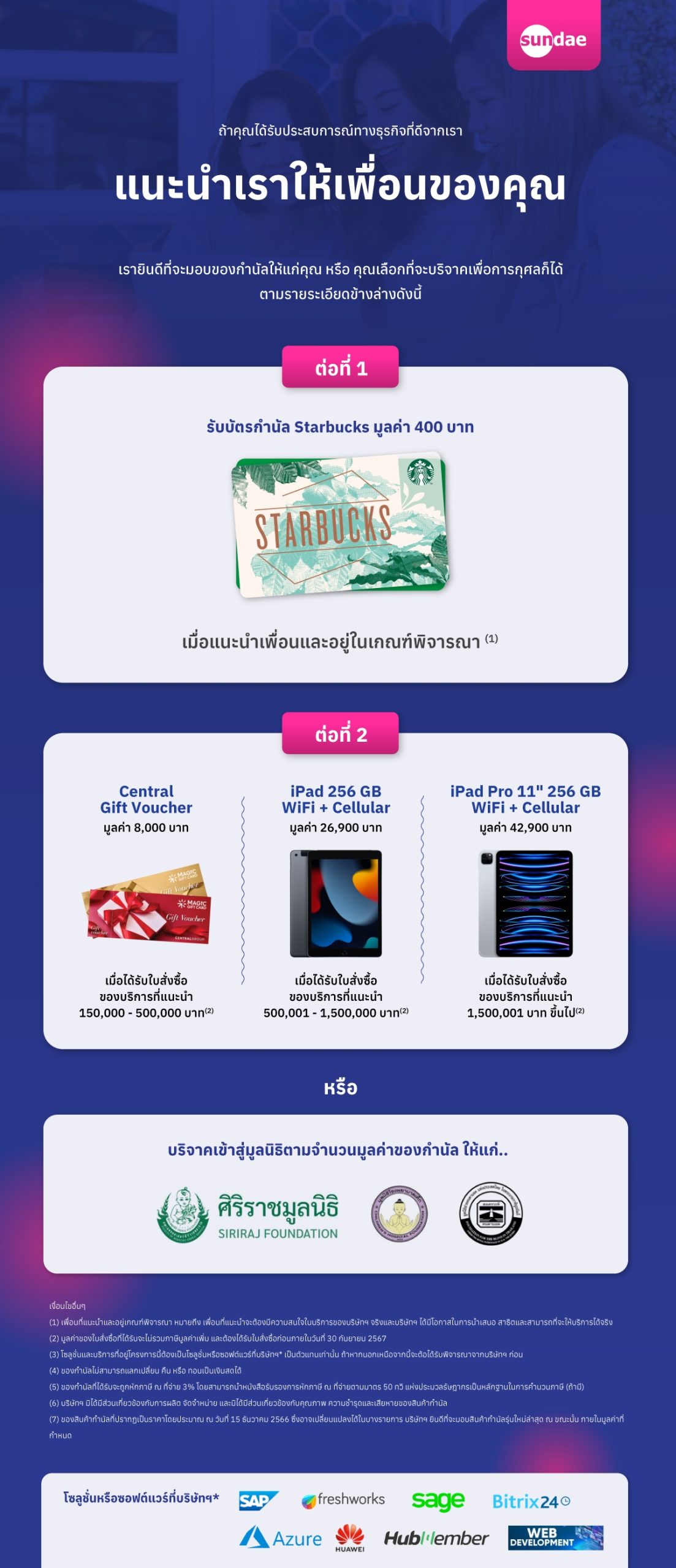 เมื่อคุณแนะนำเพื่อนให้กับเรา เรายินดีที่จะมอบของกำนัลให้แก่คุณ หรือ คุณเลือกที่จะบริจาคเพื่อการกุศลก็ได้ (ตามรายละเอียดข้างล่าง)