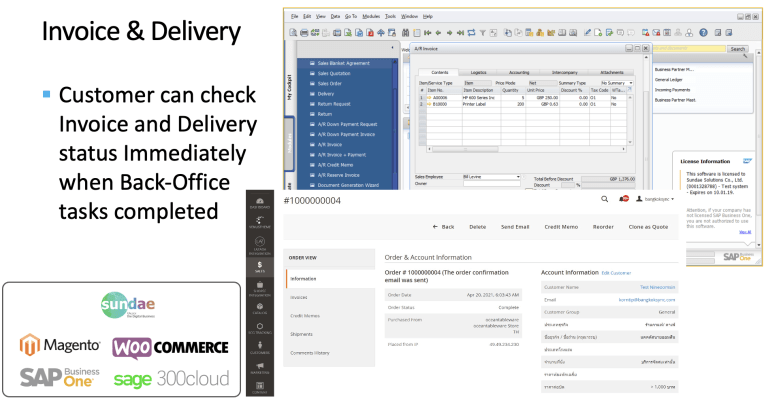 เมื่อคำสั่งซื้อเสร็จสิ้นในระบบ ERP ข้อมูลใบแจ้งหนี้และสถานะการจัดส่งจะถูกอัปเดตในอีคอมเมิร์ซ ทำให้ลูกค้าสามารถตรวจสอบข้อมูลการจัดส่งและใบแจ้งหนี้ได้แบบเรียลไทม์