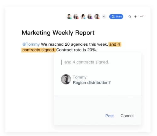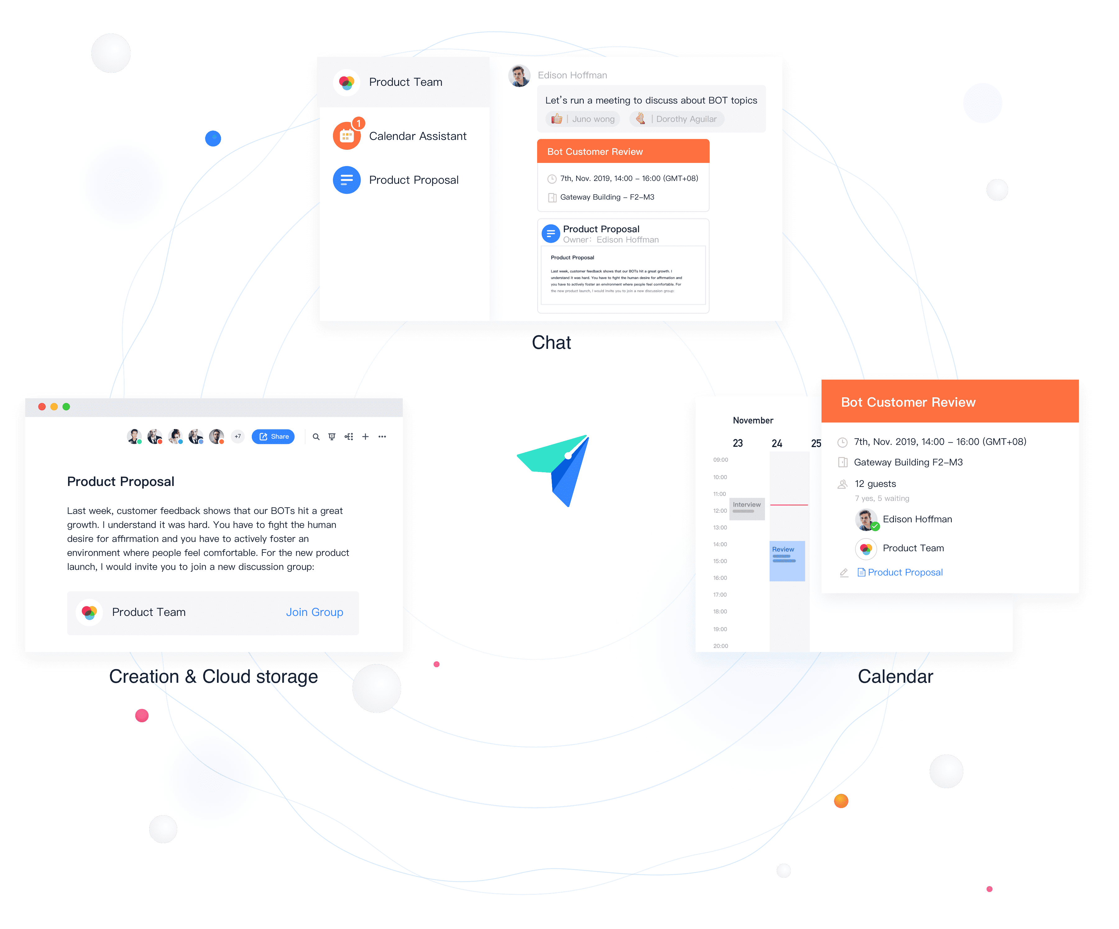Lark รวมเครื่องมือการทำงานร่วมกันที่จำเป็นมากมายไว้ในแพลตฟอร์มเดียวที่เชื่อมต่อถึงกัน ซึ่งรวมถึงแชท ปฏิทิน การสร้างสรรค์ และพื้นที่เก็บข้อมูลบนคลาวด์ ฟังก์ชันเหล่านี้จะซิงค์กันอยู่เสมอ และเข้าถึงได้ง่ายจากที่หนึ่งไปอีกที่หนึ่ง