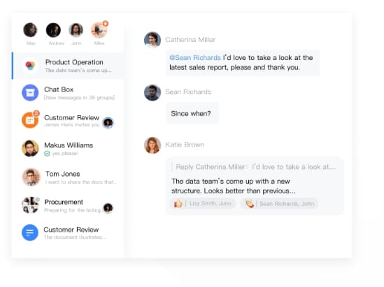 ใช้ Chat เพื่อสื่อสารระหว่างทีม แผนก และแม้แต่บริษัทอย่างมีประสิทธิภาพ การแสดงความรู้สึกด้วยอีโมจิ เธรดข้อความ การโหวต และอีกมากมายเป็นพื้นฐานที่ดีสำหรับประสบการณ์การทำงานร่วมกันที่น่าดึงดูดใจ ตรวจสอบให้แน่ใจว่าทุกคนเข้าใจตรงกันโดยไม่ต้องพึ่งอีเมลและการประชุม!