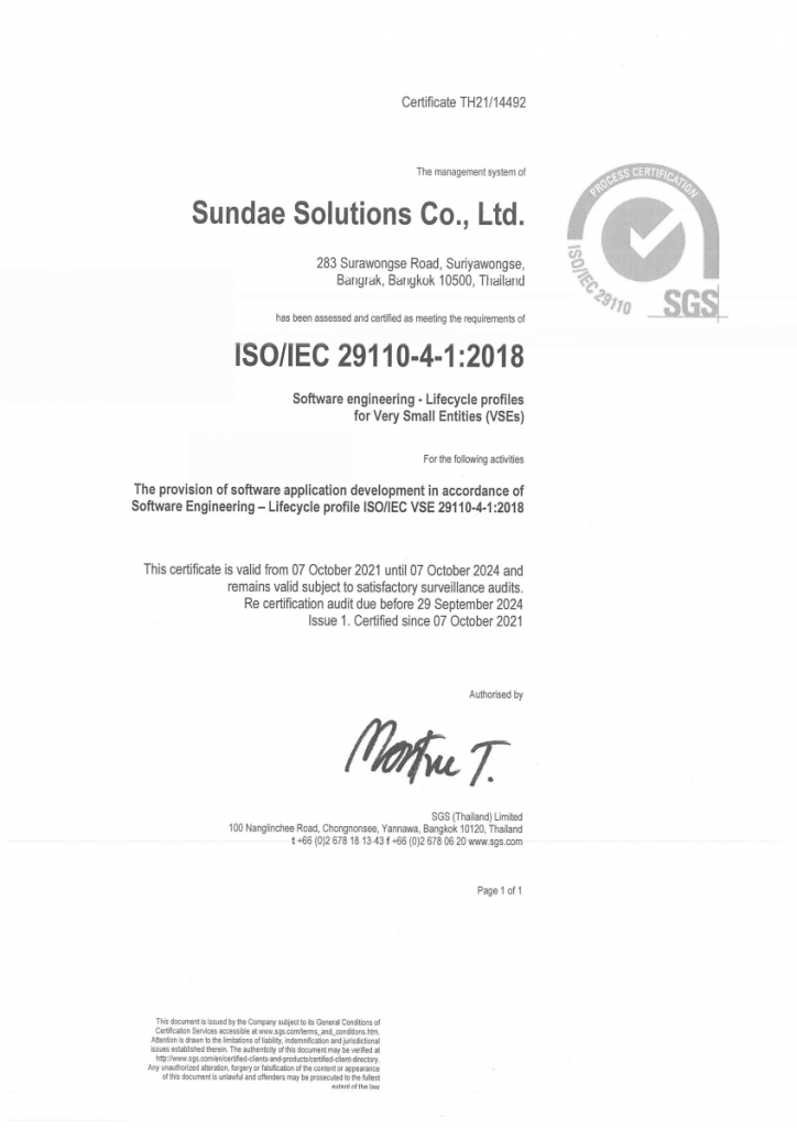 ด้วยมาตรฐานฯ ดังกล่าว จะผลักดันให้ ซันเด โซลูชันส์ มีกระบวนการพัฒนาและการบริหารที่ชัดเจนและครอบคลุมการปฏิบัติงานอย่างรอบด้าน เกิดการสร้างความสำเร็จด้วยการบริหารความเสี่ยงและสร้างกระบวนการบริหารที่เป็นระบบ มีการกำหนดบทบาทและหน้าที่ของบุคลากรทางด้านวิศวกรรมซอฟต์แวร์อย่างชัดเจนตามกระบวนการฯที่กำหนดไว้ เกิดประสิทธิภาพในการปฏิบัติงานร่วมกันและสร้างความร่วมมือ เพื่อประโยชน์สูงสุดเป็นไปตามหลักเกณฑ์ที่กำหนดและกระบวนการมาตรฐานสากล โดยได้รับการรับรองมาตรฐาน ISO/IEC 29110 (Software Engineering-Lifecycle Profiles for Very Small Enterprises (VSE) ด้านการพัฒนาซอฟต์แวร์ จาก SGS (Thailand) Limited บริษัทชั้นนำด้านการทดสอบมาตรฐานและฝึกอบรมจากสวิตเซอร์แลนด์ ให้ไว้ ณ วันที่ 7 ตุลาคม 2564